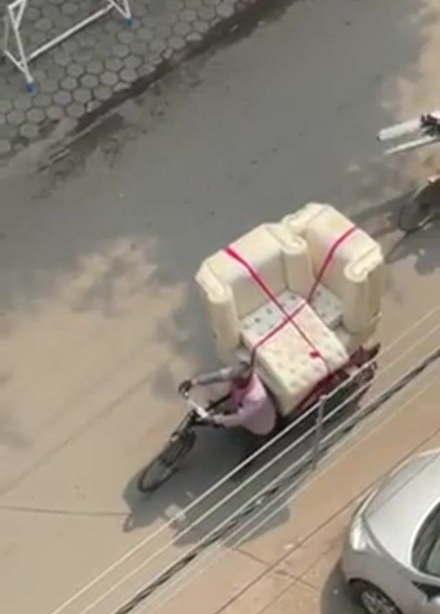 The video presents an aerial view of a street scene. An older man is riding a bicycle with a large, white, cushioned armchair strapped to the back. The armchair is secured with red straps. Following behind him is another man on a similar bicycle-cart configuration, transporting long, silver pipes and other materials on his cart. The street is paved and has painted lane markings. There are parked cars visible along the sides of the street, including a silver hatchback and a larger, dark-colored SUV. Power lines run overhead. A small, white soccer goal is positioned on the sidewalk. The scene is brightly lit, indicating a sunny day.