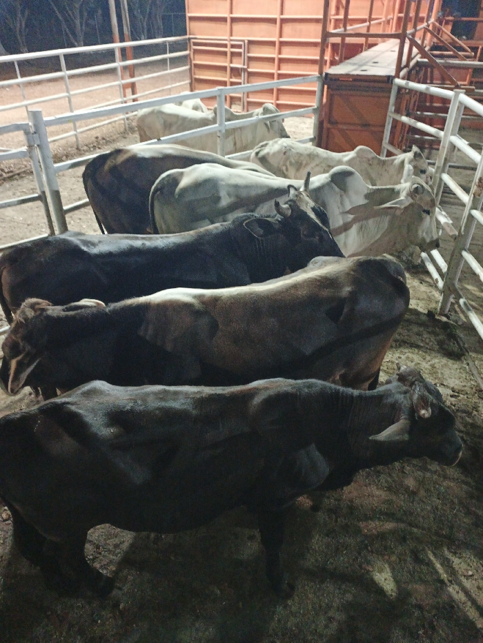 A group of cattle stands in a pen. The pen is constructed of metal bars. The cattle vary in color, from white to brown to black. The animals are closely packed together. Some have horns. In the background, a reddish-orange wall is visible. The lighting is dim, creating strong shadows. The ground beneath the cattle is a mix of dirt and hay.
