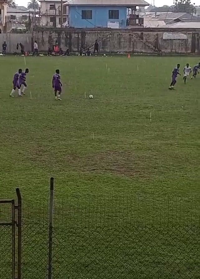 soccer game in progress on a green field. It is raining, and droplets are visible. The soccer players are wearing different color uniforms: one team wears white and the other wears purple. There is a soccer ball in the center of the field with players from each team around it. In the background, behind a grey concrete wall, are buildings. There is a black chain-link fence in the foreground.