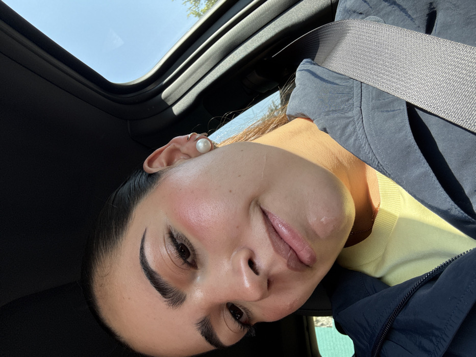 A woman wearing a pearl earring and a seatbelt is posing in a car. She’s wearing a light yellow t-shirt underneath a dark blue jacket. The car's sunroof is open, exposing the sky above. She has a full face of makeup, including blush and lipstick. Her eyebrows are dark and arched.