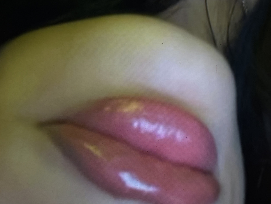 This image presents a tight, upward-angled close-up of a human mouth. The central focus is a pair of full, symmetrical lips, coated in a reflective, glossy, medium-pink substance, indicative of lipstick or lip gloss. The upper lip exhibits a slight upward curve at its center, contributing to the overall shape. The surrounding skin, visible in the upper right and lower left quadrants, is light-toned and smooth, showing no distinctive markings or blemishes. The background is uniformly dark and heavily out of focus, providing no environmental context. No other individuals, objects, or actions are discernible within the frame. The specific location within the city of Novoe Devyatkino, Russia, cannot be determined from the visual information present in the image.