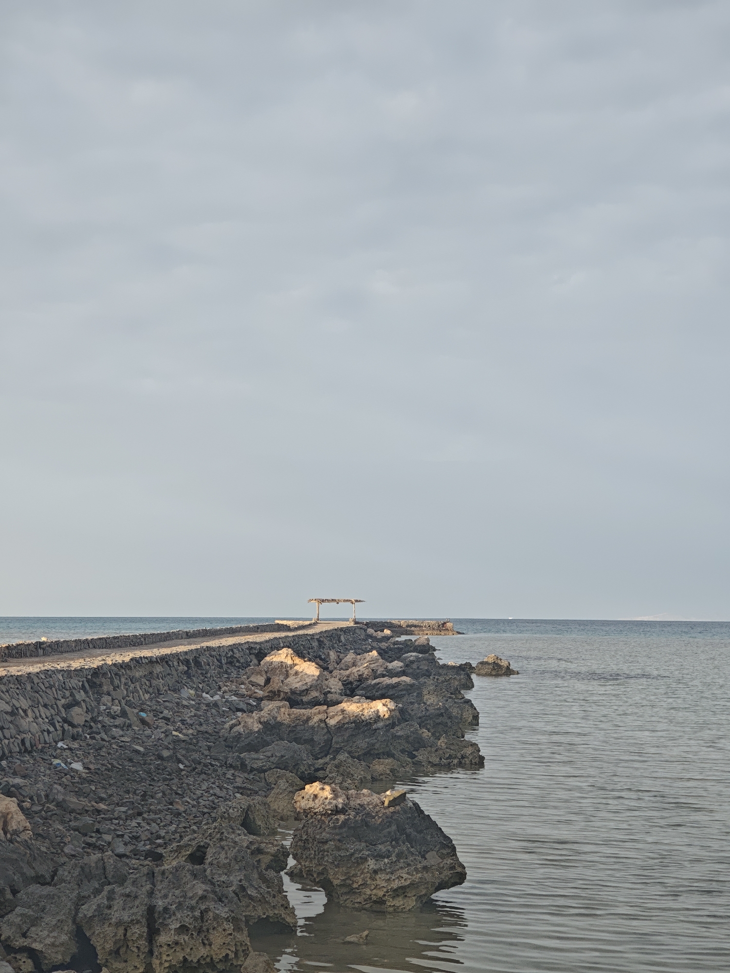 The image displays a coastal scene in Al Ahia', Egypt, under an overcast, light grey sky. A substantial, dark grey rock jetty extends from the left midground into the calm, grey-blue sea towards the center-right horizon. The jetty's construction includes a low, flat path bordered by a stone wall on the seaward side. Near the end of the jetty, a small, open-sided structure with a light-colored, possibly thatched, roof is visible. The immediate shoreline and the base of the jetty are composed of rugged, porous dark rocks, some exhibiting lighter mineral deposits and partially submerged in the water. Scattered debris, including plastic bottles and bags, is present among the rocks on the landward side of the jetty. The sea surface is mildly rippled in the foreground and smoother towards the horizon. A faint, distant landmass is discernible on the far right horizon. No people or active subjects are present.