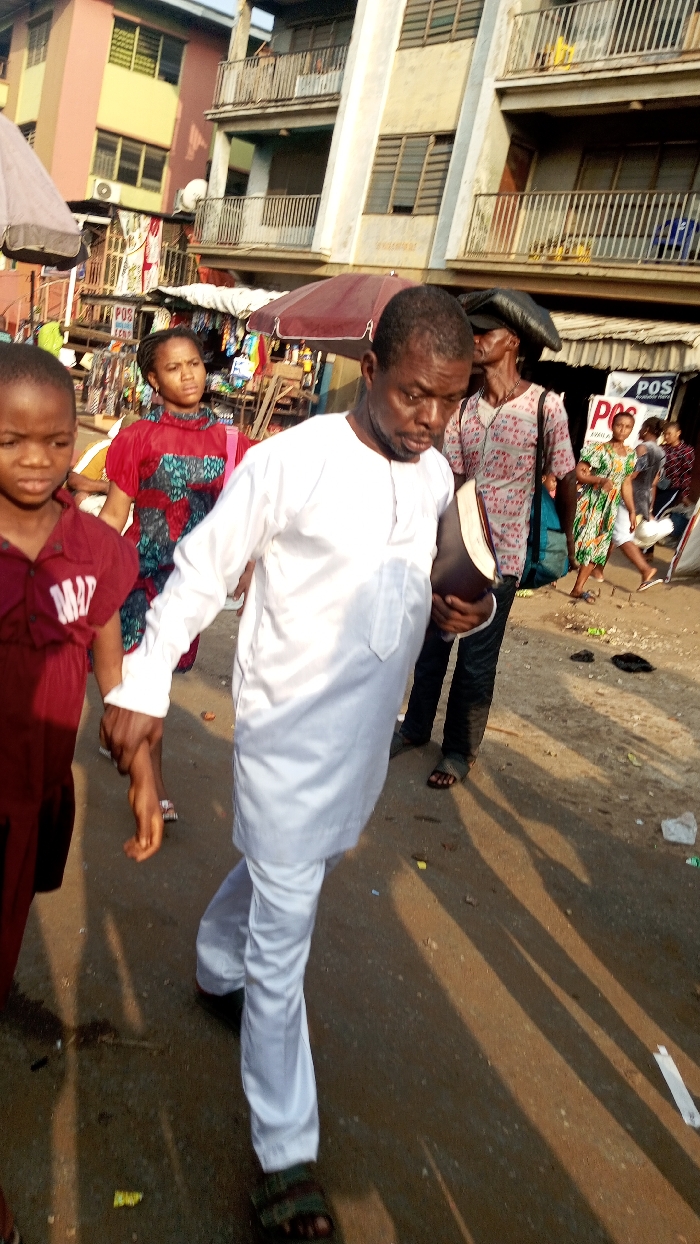 - "A man in a white outfit, carrying a book, walks on a street beside a child wearing a burgundy shirt" by FM-zG9EL2, licensed under CC BY 4.0