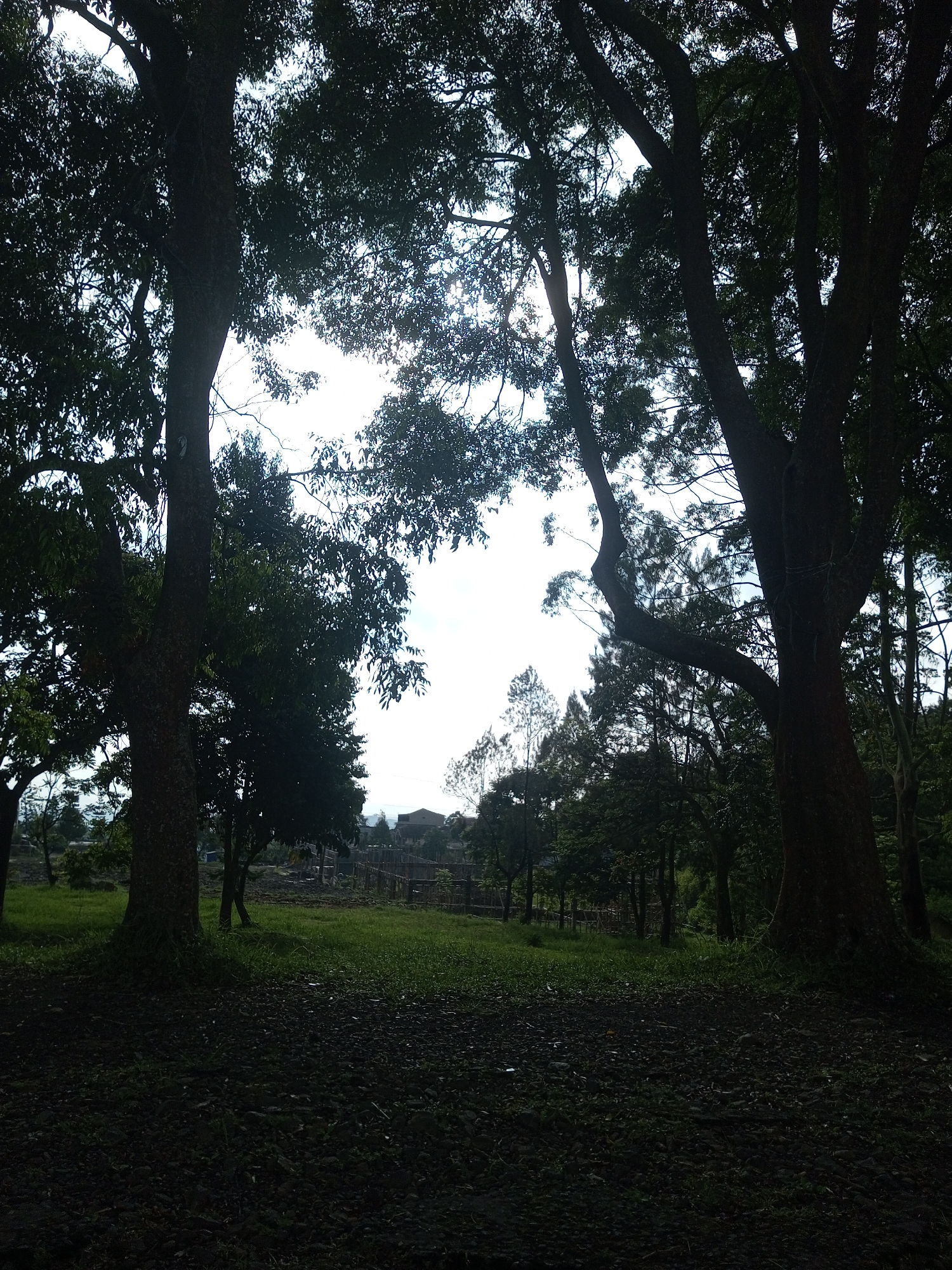 The image depicts a landscape scene in Mya Sit Kaing Ywar Thit, Myanmar. The foreground is dominated by a dark, rocky ground that transitions into a patch of green grass. Two large trees frame the scene, one on the left and one on the right, with their canopies meeting overhead, filtering the sunlight. In the distance, behind a wooden fence, are other trees and possibly a building or houses. The sky is visible through the trees, appearing bright with some clouds.