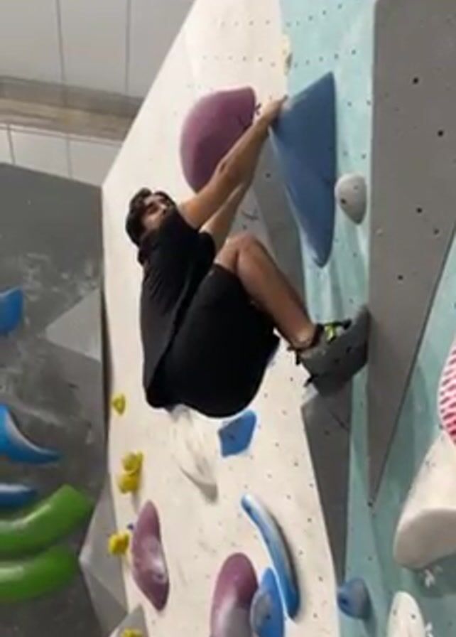 - "A man in black clothing and climbing shoes is bouldering on an indoor climbing wall with various colored handholds" by FM-F7MKp2, licensed under CC BY 4.0