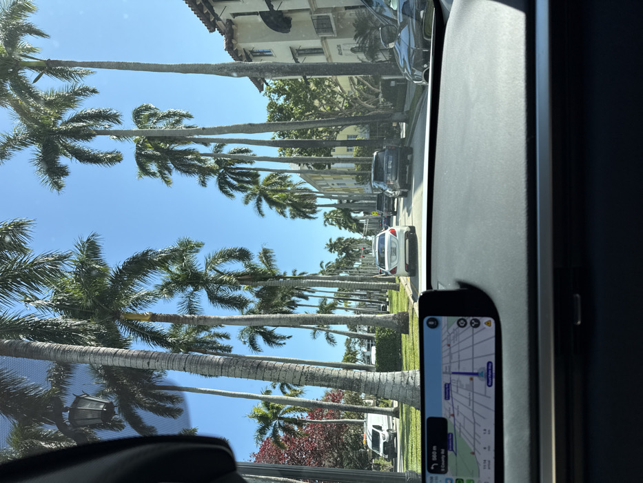 A sunny street view framed from inside a car, displaying rows of palm trees lining both sides. Cars are parked or moving along the road. A building is visible in the background. A smartphone displaying a navigation app is mounted on the dashboard, showing a map and direction. The image is taken from an oblique angle.