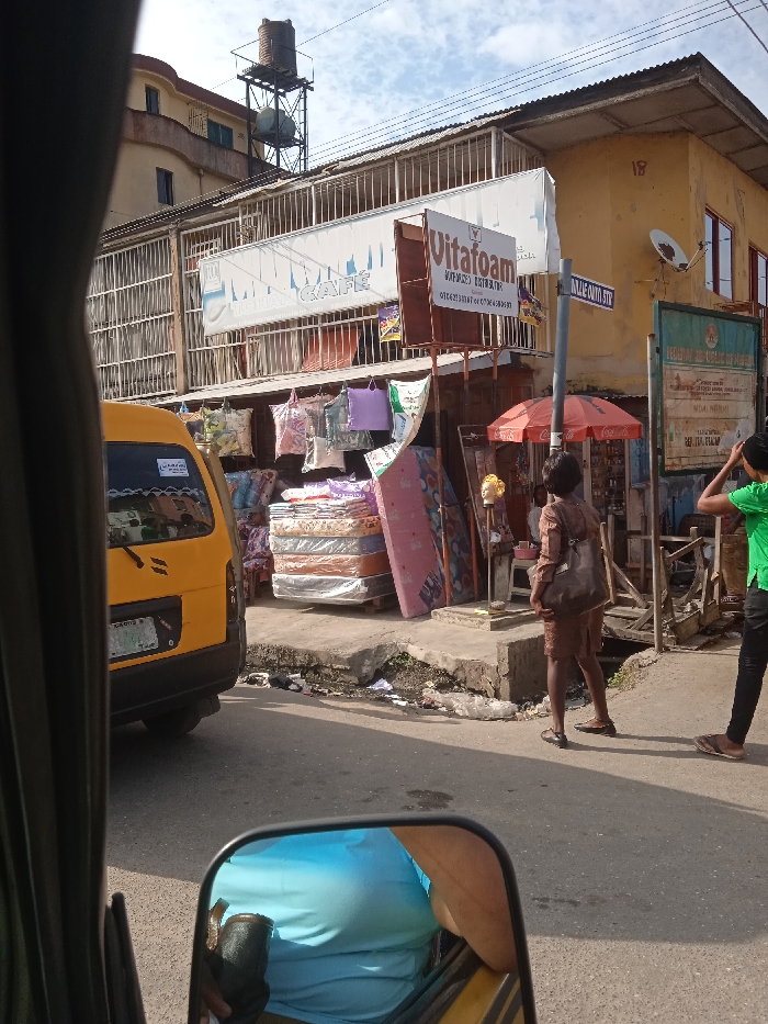 The image depicts a daytime street scene in Animashawun, Nigeria, observed from within a vehicle, with a reflection of a person in a light blue shirt visible in the side mirror. On the left, a yellow commercial van or bus is partially visible from the rear, displaying a license plate partially reading "ABC CITY". The street ahead is asphalt. A commercial area unfolds on the right side of the street, featuring a raised concrete sidewalk with debris and a visible drainage channel. The ground floor of a building is occupied by a shop selling mattresses and bedding, evidenced by stacks of mattresses on pallets and various patterned bags and pillows hanging. Overhead, a large white banner reads "Vitafoam" with contact information, and another banner states "URBAN CAFÉ". This shop is part of a two-story yellow building on the right, which has red-framed windows and a satellite dish on its facade, marked with the number "18". Above and slightly to the left, a multi-story building with a brown facade and a curved balcony features a tall metal structure on its roof supporting a water tank. On the sidewalk, two pedestrians are visible. A person in a brown dress or skirt and top, carrying a dark shoulder bag, stands with their back to the camera, looking to the right. Further right, a second person in a green t-shirt and dark pants stands similarly, also facing away from the camera. Adjacent to these individuals, a red Coca-Cola branded umbrella shades a vendor stall, where a mannequin head adorned with a wig is displayed. A gray pole supporting a street sign indicating "ANJIE OZI STR" is centrally located on the sidewalk. A large green sign, partially obscured, is visible on the far right. Overhead power lines are present. The sky is partly cloudy.
