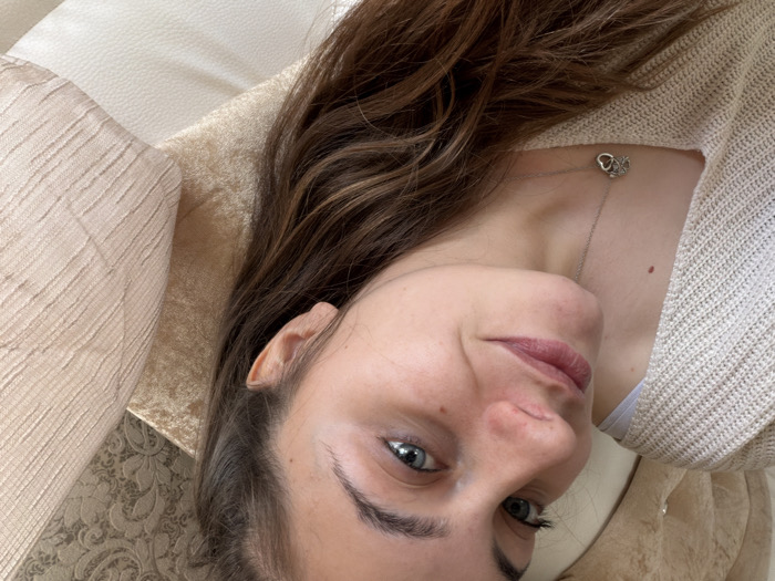 The scene depicts an interior setting within the city of General Toshevo, Bulgaria. A female individual is positioned in a semi-reclined or lying posture, captured from a slightly elevated, close-up perspective. She possesses long, dark brown hair, parted centrally and extending over her right shoulder. Her eyes are light blue, and her expression features a subtle smile. Visible facial features include a small reddish mark on the bridge of her nose and several minor freckles or blemishes on her cheeks. She is wearing a light beige or off-white knitted sweater with a visible ribbed texture. A thin white strap, consistent with an undershirt or bra, is partially visible on her left shoulder. Around her neck, a silver-colored chain necklace with a pendant featuring a small heart intertwined with an abstract or ornate design rests against her chest. A small, dark mole is located on her lower neck/upper chest area, below the necklace. The background consists of soft furnishings. Immediately to her right, a light-colored, vertically ribbed fabric pillow or cushion is visible. Behind her head, an upholstered surface with a light-colored, ornate damask-like pattern is present, likely a headboard or part of a sofa. Below the pillow, a section of plain white or cream-colored smooth fabric, possibly upholstery or bedding, is visible. The lighting is even and diffused.
