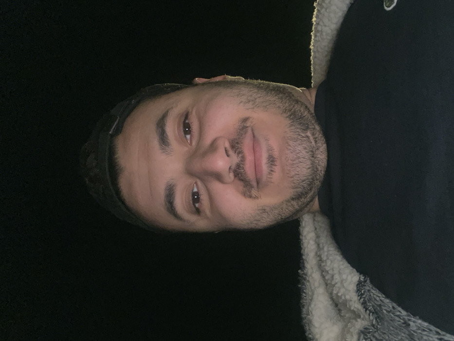 A man gazes at the viewer in a close-up shot. He wears a black beanie and a dark top with a small green logo. The man has brown eyes, short dark hair, and a trimmed beard. The background is predominantly black, hinting at nighttime or a dimly lit environment. A textured, light-colored material is visible at the edge of his shoulder.
