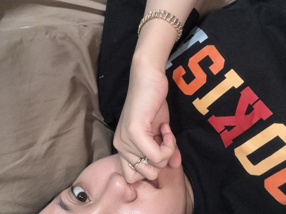 A person lies on a brown bedspread, wearing a black shirt with a multicolored logo that reads "ISTOKI" in stacked, block letters. A gold bracelet adorns the right wrist. The person's face is partially visible; one brown eye is open, gazing at the camera. A gold ring is visible on one of the fingers near the face. The person's hand is positioned near their nose.