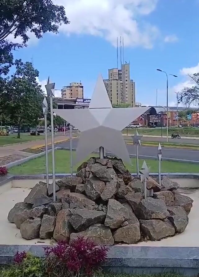 The video presents a static, eye-level view of a small public space. A central monument consisting of a large, metallic white star, is elevated on a mound of rough, gray rocks. The monument also has smaller, spear-like metallic decorations surrounding it. The space is a landscaped green area with trimmed grass and decorative plants along a concrete edge. In the background, there is a road with light traffic, buildings of varying heights, and a blue sky with scattered clouds. The day appears sunny and bright. The camera remains still throughout the recording.