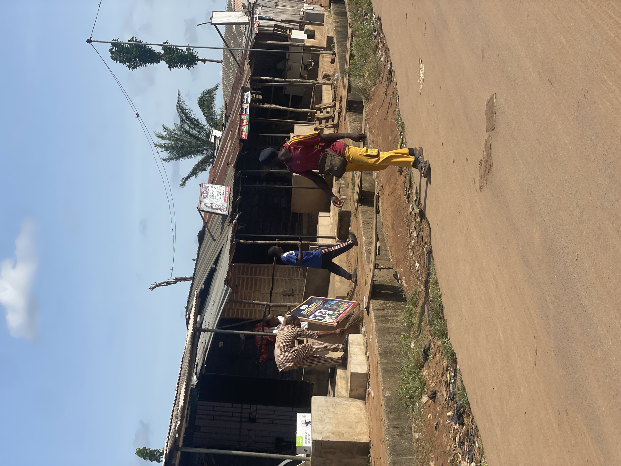 The image depicts a street scene in Ikoga, Nigeria. The street is unpaved, with buildings lining one side. The buildings appear to be constructed from corrugated metal and wood. Three people are visible: one is standing on the sidewalk, wearing a red shirt, yellow pants, a black cap, and a brown bag over his shoulder; another is walking nearby and wearing a blue shirt and black pants; another is sitting on the steps of the buildings, holding something. The sky is blue with scattered clouds. A palm tree and an antenna are visible. A poster is displayed on the front of the building.