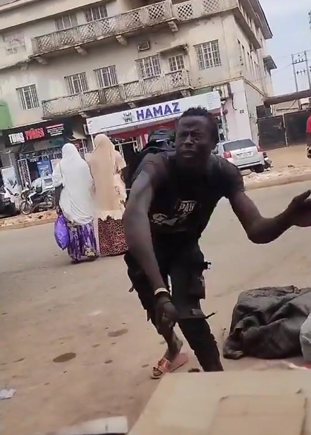 person with a backpack and a knee brace standing on the street. The person is wearing a dark shirt, dark pants, and sandals. They are gesturing with their arms and appear to be talking. Behind the person are some large bags on the ground. In the background, there are several buildings, including one with a sign that reads "HAMAZ." There are also a few people walking around. The street appears to be dirty and there is some trash on the ground. The video is shot from a slightly low angle.