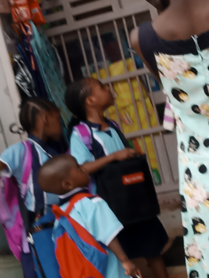 Three school children are seen, two girls and a boy, wearing light blue shirts and carrying backpacks. The girls have braided hair. One girl is holding a black tote bag with a red label. All three are looking upwards. In the background is a barred structure with yellow objects behind it, and some items hanging to the side. A woman wearing a floral patterned dress stands to the right.