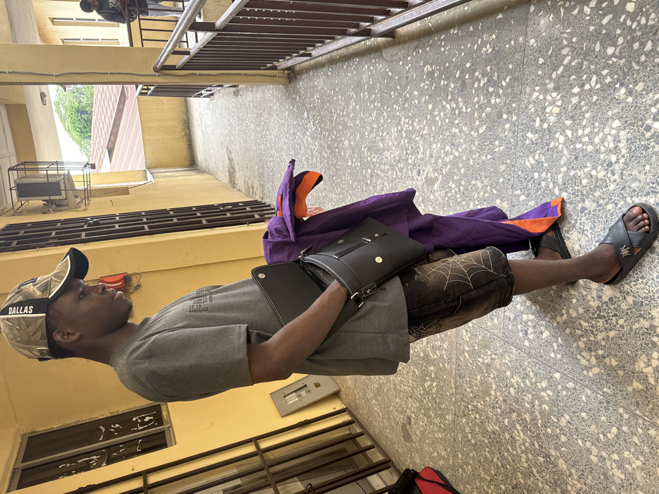 The image depicts an outdoor, elevated walkway or corridor of a building in Ihiagwa, Nigeria, characterized by yellow-painted walls and a speckled grey terrazzo floor. In the foreground, a dark-complexioned male, estimated to be young adult, stands facing left, looking downwards. He wears a camouflage "Dallas" baseball cap, a grey short-sleeved t-shirt, dark shorts with a white spiderweb pattern, and black slide sandals. A black shoulder bag with white stitching is worn across his body, with his right hand partially inside the bag. Draped over his left arm is a purple garment with an orange interior. To the subject's left, a window with dark metal security bars is visible, with two light-colored rectangular panels leaning against the wall beneath it. A red bag is partially visible at the bottom left corner. Directly above, a white wall-mounted air conditioning unit is present. To the subject's right, a brown metal railing delineates the walkway. Further down the corridor, another male figure stands, actively engaged with a mobile phone. Beyond the railing, a reddish-brown corrugated metal roof and green foliage are visible under an overcast sky, indicating an outdoor urban or suburban setting. The lighting is bright and diffuse.