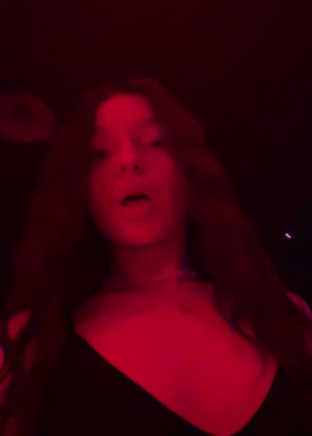 A young woman is standing in a dimly lit room, illuminated by red light. She is wearing a dark top with a low neckline and a choker necklace. Her long, dark hair falls loosely around her shoulders. She looks directly at the camera and speaks. The background is dark and out of focus. Music plays in the background.