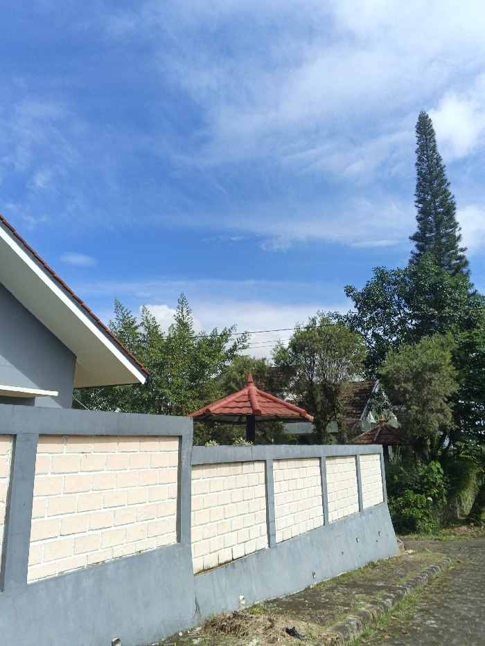 The image depicts an outdoor daytime scene in Đà Nẵng, Vietnam, characterized by architectural structures and dense foliage under a blue sky. The sky, occupying the upper half of the frame, is clear blue with sparse, wispy white clouds. In the lower mid-ground, a horizontal retaining wall or fence is prominent. This wall features a dark grey concrete base and vertical pillars, with infill panels constructed from light beige, rectangular bricks laid in a stretcher bond pattern with white mortar lines. To the upper left, the corner of a building is visible, featuring grey walls and a sloped roof with dark red tiles and white eaves. Behind the wall and house, extensive green tree foliage dominates the background. A tall, slender conifer with dark green needles stands vertically on the far right, extending high into the sky. Amidst the trees, two structures with distinctive dark red, multi-faceted conical roofs are visible, resembling gazebos or kiosks. One is positioned centrally behind the fence, and another is partially obscured further to the right. Additional buildings with dark-tiled roofs are partially visible through the trees in the distance. A thin, dark line, possibly a utility wire, traverses horizontally through the trees above the central gazebo. The foreground at the bottom right shows a dark grey concrete curb bordering a paved area composed of dark grey or black interlocking paving stones. Sparse dry grass and debris are visible along the base of the fence and curb. No individuals or specific actions are depicted.