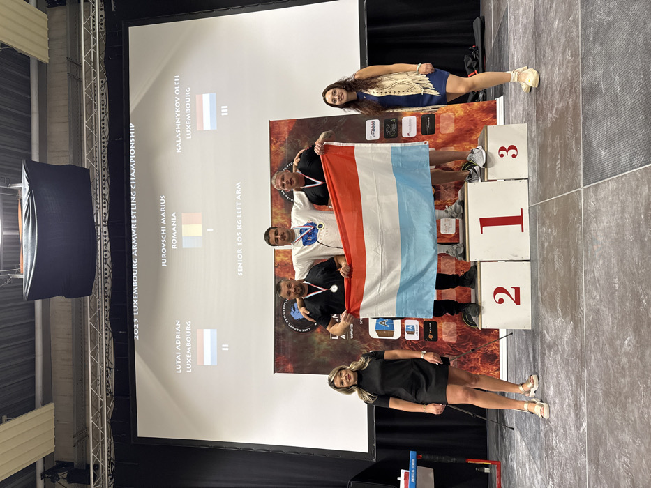 n arm wrestling championship award ceremony. Three men stand on a podium with numbers "2," "1," and "3". They are holding the flag of Luxembourg. A screen in the background displays "2025 LUXEMBOURG ARMWRESTLING CHAMPIONSHIP," and the names and nationalities of the top three competitors in the Senior 105 KG Left Arm category: Jurovsch Marius (Romania), Lutai Adrian (Luxembourg), and Kalashnykov Oleh (Luxembourg). Two women stand on either side of the podium.