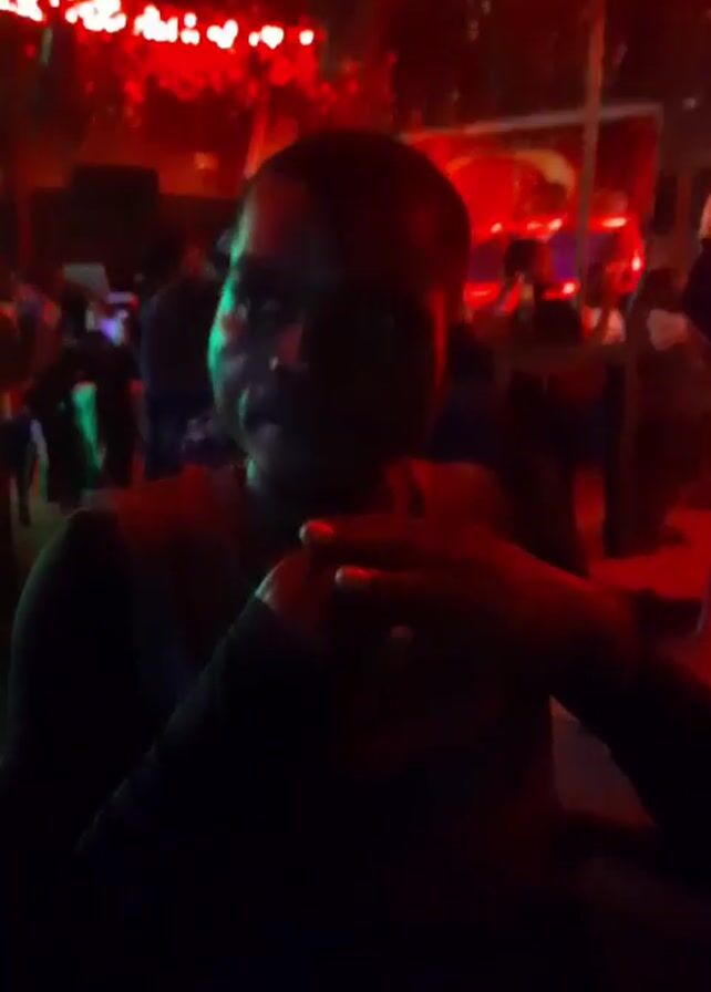A person with dark skin sits with their hands clasped, looking to the left. The person wears a dark top. The location appears to be outdoors at night, with red string lights overhead. Other people can be seen in the background, some standing and some sitting. A sign or poster is visible behind the person. The lighting is dim and uneven, creating shadows. The scene seems to be at a bar or outdoor event.