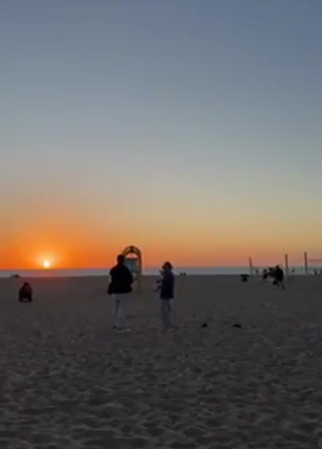 The video depicts a beach at sunset. The sun is setting over the ocean, casting a warm orange glow across the sky. The beach is sandy and populated with several people. Two figures stand near a yellow playground structure, possibly taking photos or observing the sunset. Other individuals are seen walking or sitting on the beach, and a volleyball net is visible in the distance. The overall scene is tranquil, capturing a moment of appreciation for the natural beauty of the setting sun.