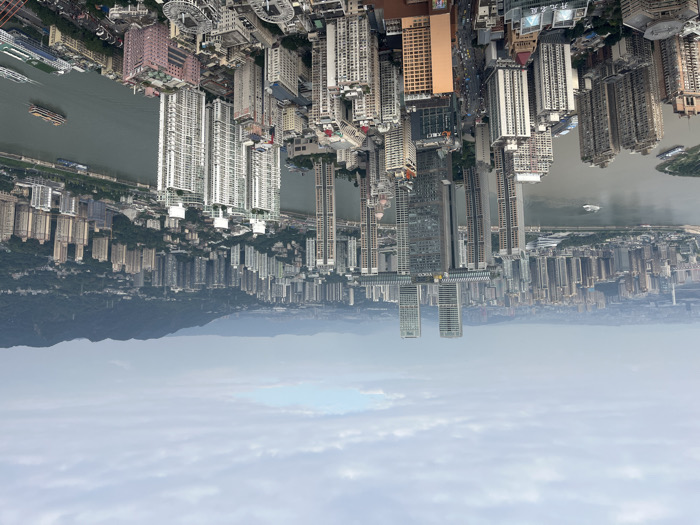 n aerial view of a modern city situated along a river. High-rise buildings, including skyscrapers and residential towers, dominate the urban landscape. The river runs through the city, with boats visible on its surface. A mountain range forms the backdrop, adding depth to the scene. The sky is overcast with clouds.