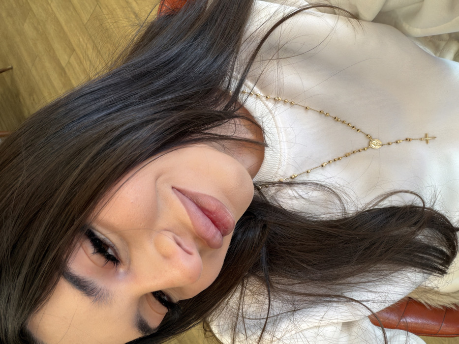 A close-up, high-angle portrait features a female individual with long, dark brown hair cascading over her shoulders and partially obscuring the right side of her face. She is looking slightly down and to the viewer's left, displaying a closed-mouth smile. Her visible left eye is accented with dark eyeliner and extended eyelashes. She wears a cream-colored crew-neck sweatshirt. A long, delicate gold-colored rosary necklace with small beaded links, a circular medallion, and a crucifix pendant hangs over her sweatshirt. The background is out of focus, showing a reddish-brown upholstered surface to the lower left and a light-colored wooden floor or tabletop to the upper right. The specific location within the city of Yerevan, Armenia, cannot be determined from the provided image.
