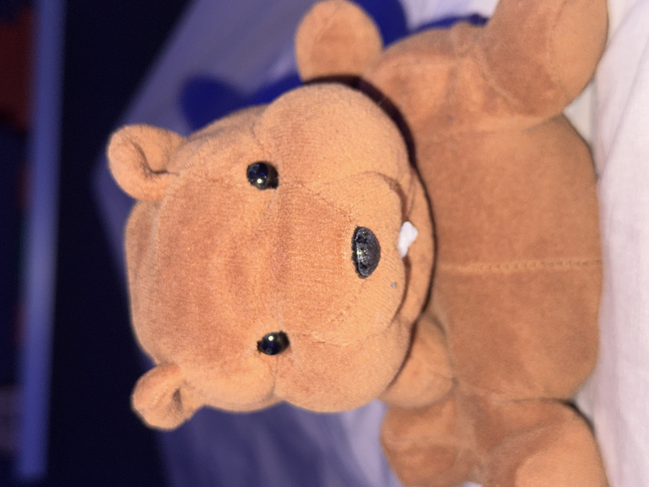 A close-up shot features a plush, brown teddy bear with beady black eyes. The bear is lying on its back on a white surface, with a blueish-purple background visible. It has small, rounded ears and a shiny black nose. A tiny, white protruding element can be seen near the nose, possibly a faux tooth or a loose thread. The bear's body is soft and rounded, showcasing the plush material.