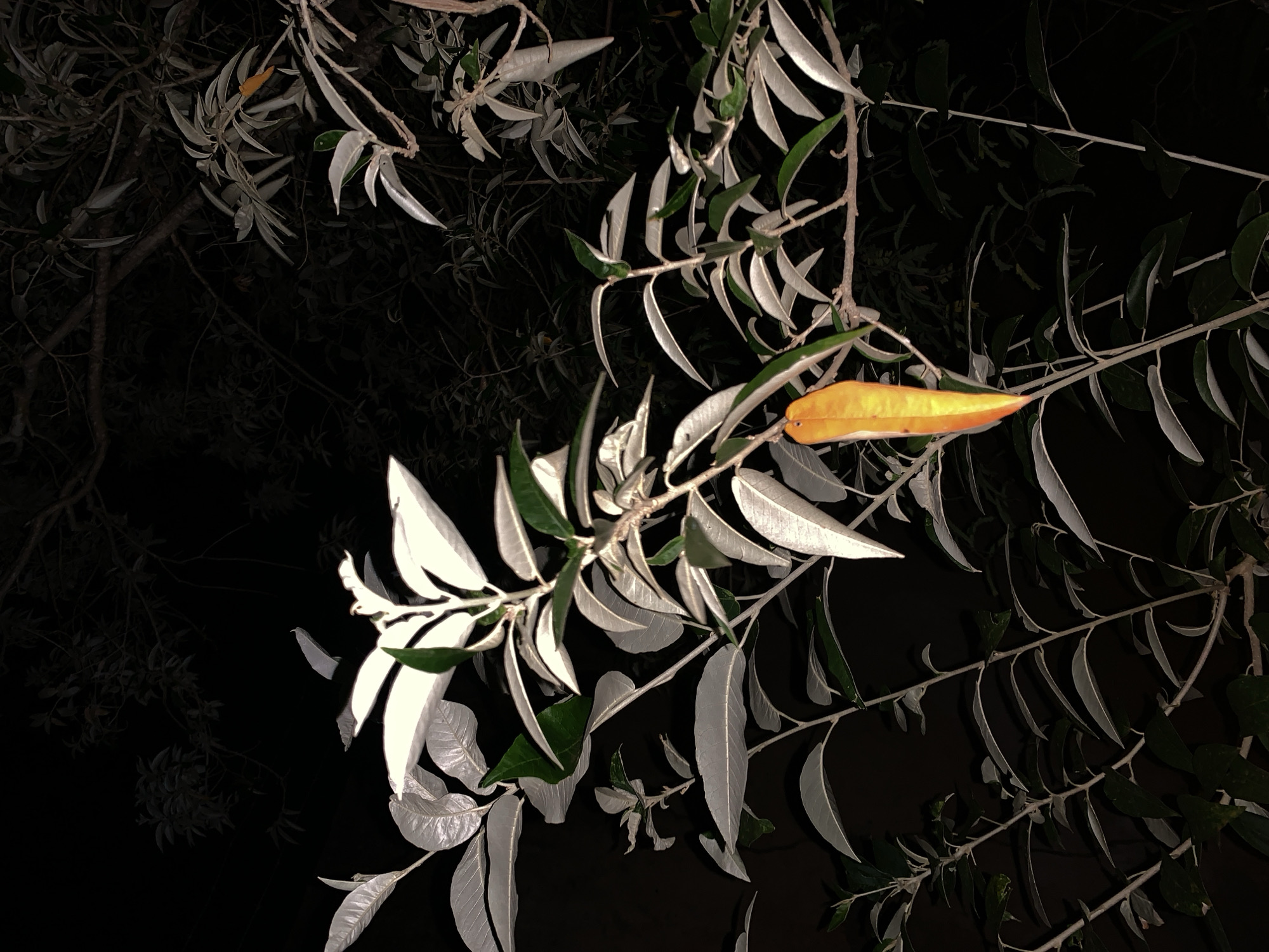 The image depicts a nighttime scene of foliage, potentially a tree or shrub, set against a dark, possibly black, background. Most of the leaves appear to be silver or white, with one prominent leaf displaying a yellowish-orange hue. Some leaves exhibit shades of green. The background is uniformly dark, suggesting limited ambient light. The location is claimed to be La Tagua, Venezuela, but there is no inherent visual information in the image to verify the location. There are no visible people, actions, or interactions.