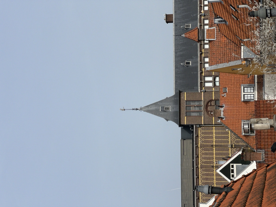 The image displays an elevated, static view of architectural structures in Leiden, Netherlands, beneath a clear, pale blue sky. The primary subject, centrally located in the background, is the Old Observatory (Oude Sterrewacht). It features a dark brown brick tower with a steep, conical slate spire, topped by a dark metal finial incorporating a weather vane and a small, horizontal crossbar. A single small, square window is visible in the spire. Adjacent to this tower, the observatory complex extends with buildings characterized by dark slate roofs, several rectangular dormer windows, and dark brick facades featuring evenly spaced, white-framed rectangular windows. A dark brick chimney stack rises from the right section of the main observatory roof. A faint, thin white contrail is discernible in the upper left quadrant of the sky. In the midground, a cluster of residential or commercial buildings is visible. These include structures with textured red-tiled roofs, some featuring dark-paneled gables with white trim, and facades composed of brickwork with distinct horizontal yellow banding. A building with a bright yellow painted exterior is partially visible on the right. The immediate foreground consists of several red-tiled rooftops, displaying weathered textures. Observable objects include a black metal chimney pipe on the left, a light-colored, possibly concrete or stone, chimney structure with a cylindrical metal vent near the center, and additional dark chimney pipes on the right. A portion of a leafless tree or shrub with white blossoms is present on the lower right edge. No individuals, vehicles, or explicit human activities are depicted in the scene.