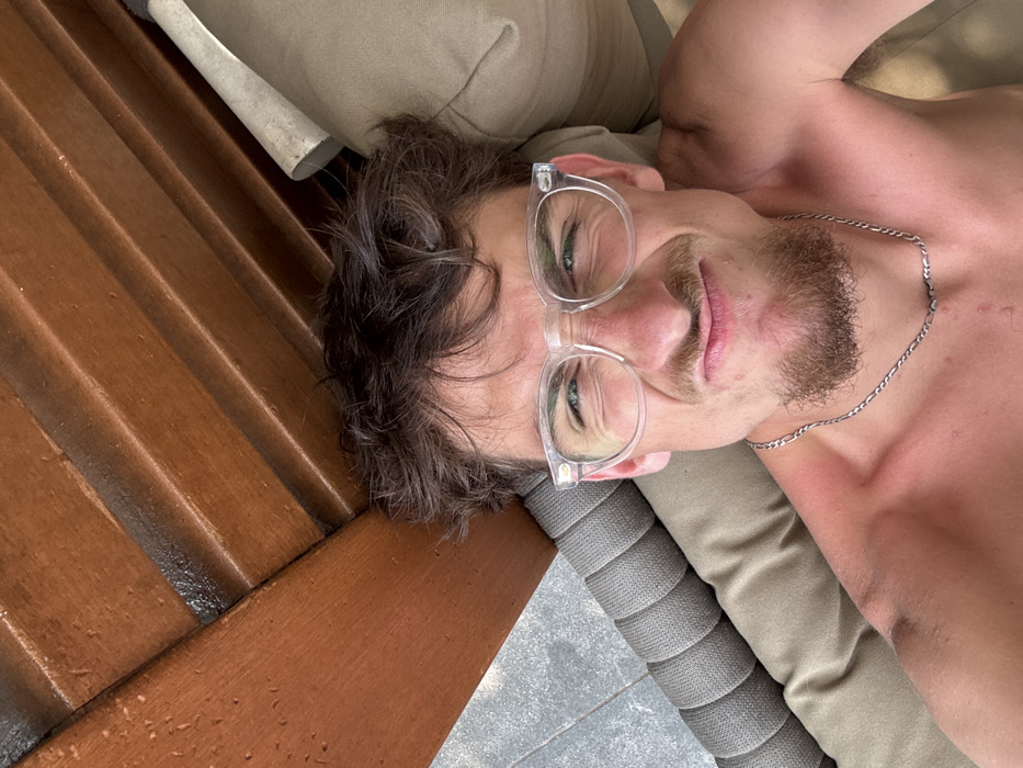 A fair-skinned man with brown hair and a beard is laying on his side on a cushioned lounge chair. He wears clear-framed glasses and a silver chain around his neck. The lounge chair has brown wooden slats and gray textured cushions. A light gray, textured surface is visible beneath the chair. He is smiling slightly at the camera.