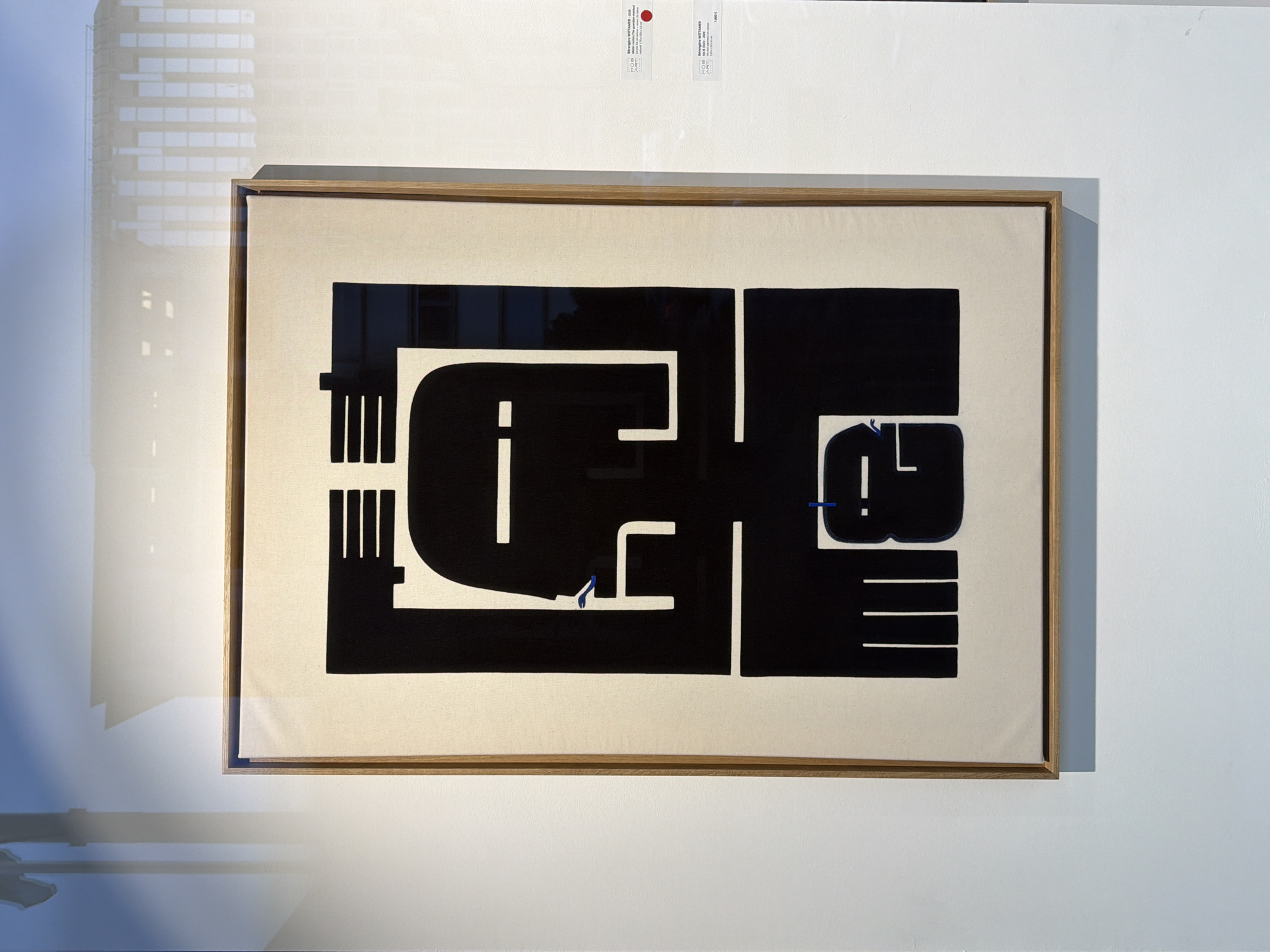 An abstract artwork is prominently displayed on a light-colored wall, likely within an art gallery or exhibition space in Luxembourg City, Luxembourg. The artwork itself is a rectangular canvas featuring bold, black geometric shapes on a cream-colored background, forming a stylized, modern composition that includes elements resembling faces or figures. Small, precise blue accents are visible within the black shapes. The artwork is encased in a light brown wooden frame with a transparent front, through which external elements are reflected. Reflections on the artwork's surface and the adjacent wall reveal details of the exterior environment. A distant building with a repeating pattern of vertical window-like structures is visible in the upper right reflection. On the upper left, a shadow of a vertical pole or structure is cast onto the wall, accompanied by a soft blue hue, suggesting a clear sky. Two small, white information tags, partially legible and indicating "MOM ART" and artist "Bérangère WITTAMER," are affixed to the wall to the right of the artwork, confirming its context as a gallery display. No individuals are present in the immediate scene.
