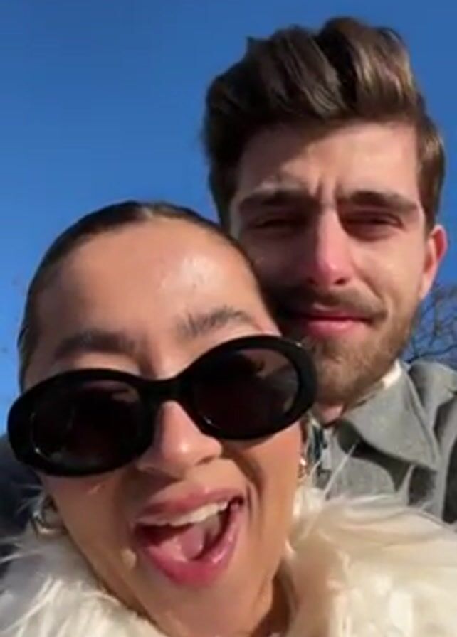 A woman wearing sunglasses and a white fur coat is taking a selfie video with a man behind her. The man has a beard and is wearing a gray coat. They are outside under a bright blue sky. The woman is smiling and excited and makes kissy faces toward the camera. The man smiles and kisses the woman on her head.