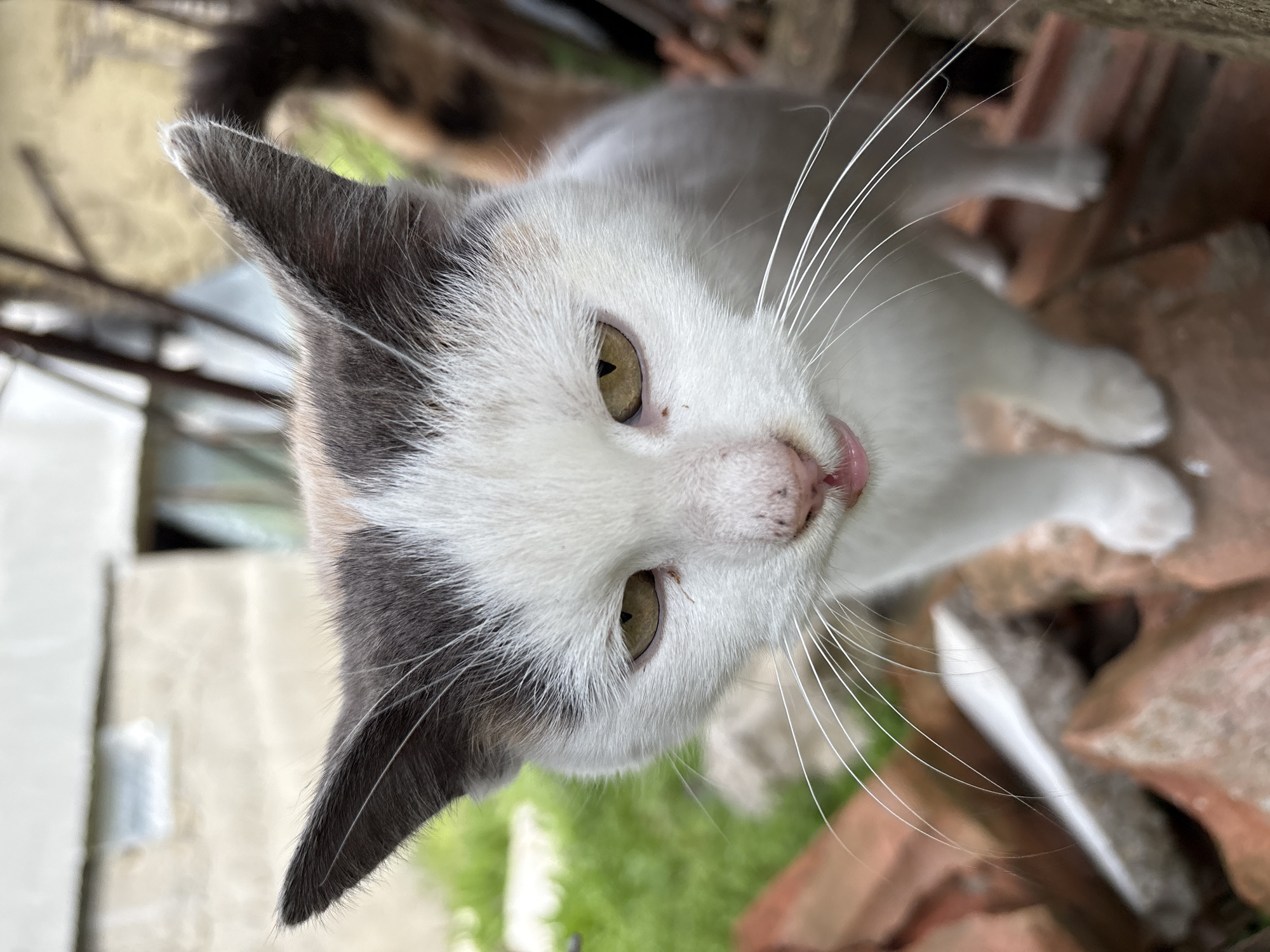 A tilted, close-up, high-angle shot shows a cat with white fur and gray markings on its head, including its ears. The cat has yellow-green eyes and a pink nose with a small amount of pink tongue visible. Long white whiskers extend from its face. The cat appears to be standing on red bricks or terracotta tiles. The background includes glimpses of green grass, another cat, and a white structure, likely located in Rabrovo, Bulgaria.