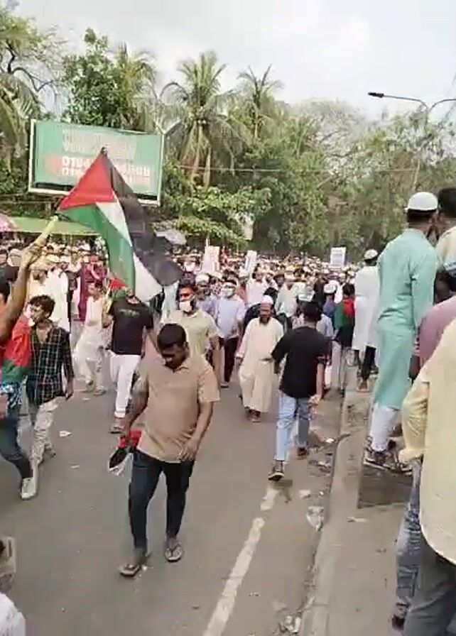 Certainly! Here's a detailed description of the video: **Scene:** The video shows a large group of people marching on a paved street, presumably a public road. The crowd appears dense and extends into the distance. The environment includes green trees and overhead utility lines. There's also a billboard with what appears to be an advertisement. **People:** The participants are primarily men of varying ages, though the composition of the crowd makes it difficult to provide exact numbers. Many of the men are wearing traditional Muslim attire, including white thobes (long garments) and skullcaps. Others are dressed in casual clothing. **Objects:** Several individuals are carrying Palestinian flags. Some participants are holding other objects, possibly banners or signs. **Actions:** The primary action is the march itself, with people moving in the same direction down the street. There's a sense of energy and potential organization in the crowd movement. The flag-waving adds to the dynamic. **Interactions:** The people appear to be interacting with each other, though specific dialogues or individual exchanges are not clearly audible or visible in the provided footage. **Environment:** The scene is set on a street lined with trees. It seems to be an urban or semi-urban environment, given the presence of overhead utility lines and the visible advertisement on the billboard. The weather appears to be overcast.