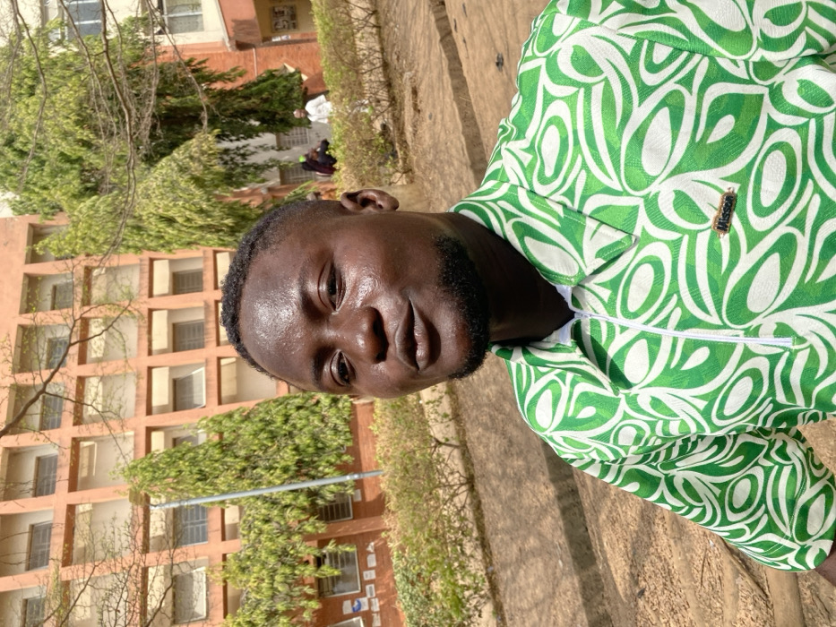 A man is posing outdoors, wearing a vibrant green and white patterned shirt. He has dark hair, a beard, and his skin appears slightly shiny. The background includes a multi-story building with numerous windows and some trees. The image seems to be taken on a bright, sunny day. There are benches or steps in the lower portion of the photo.