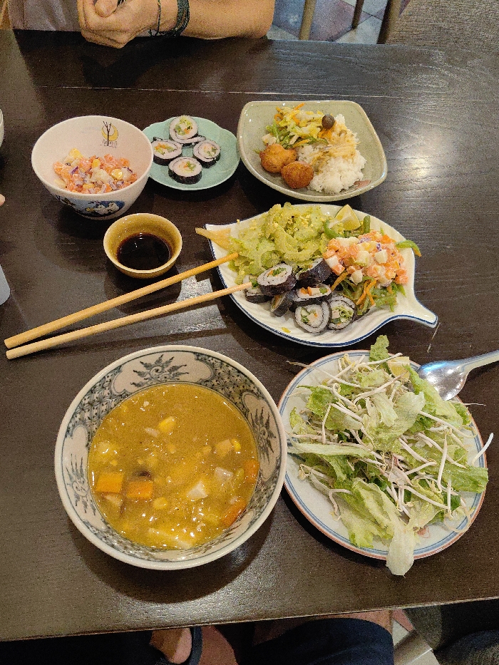 A top-down view shows a dark brown table laden with a meal for at least two individuals in a restaurant setting within Hòa Cường Ward, Vietnam. In the upper left, a white ceramic bowl with a colorful geometric pattern contains a salad of diced vegetables and possibly imitation crab meat. Adjacent to it, a small, light green, leaf-shaped plate holds six sushi rolls. To the upper right, a square, light green plate presents white rice, stir-fried vegetables, and two golden-brown fried croquettes. A small, light brown ceramic bowl contains dark soy sauce. Two pairs of light wooden chopsticks are positioned on the table; one pair rests partially over the soy sauce bowl, and the other extends across a plate. A large, white, leaf-shaped plate, centrally located on the right, holds a bitter melon stir-fry, a separate portion of a creamy salad with visible red and orange pieces, and several additional sushi rolls, garnished with a lime wedge. In the lower left, a white ceramic bowl with a blue and white patterned rim contains a yellow soup or curry with diced root vegetables and corn kernels. To its right, a round, white ceramic plate with a thin blue rim holds a fresh green salad of torn lettuce and bean sprouts, with a metal spoon resting upon it. The forearms and hands of one person, wearing a dark bracelet, are visible at the top-left edge of the table. The lower legs and feet of another individual, clad in dark trousers and light-colored flip-flops, are partially visible beneath the table at the bottom.