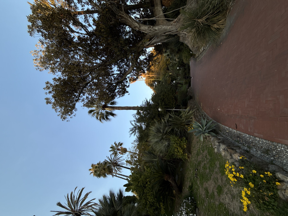 The scene depicts a path within the Giardini di Villa Ormond in Sanremo, Italy