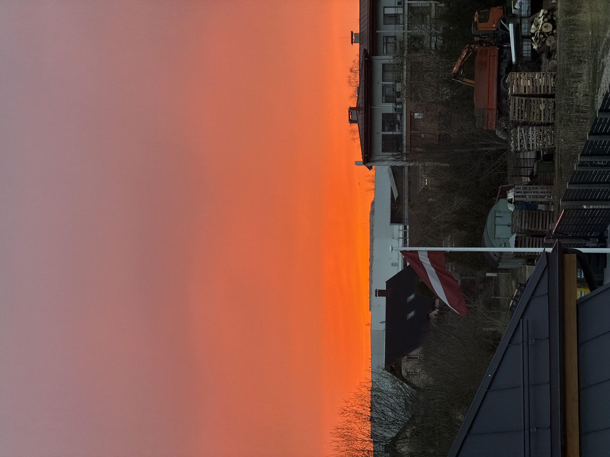 The image depicts a landscape with an orange and purple-hued sky dominating the left half of the frame, likely during sunrise or sunset. The right half contains buildings, bare trees, a Latvian flag on a pole, and various objects including a truck and stacked pallets. The scene is likely in a residential or suburban area, consistent with the characteristics of Dreiliņi, Latvia. The foreground includes a dark, angular rooftop. The overall impression is that of a quiet moment in an urban setting during dawn or dusk.