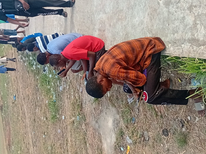 The image depicts an outdoor scene in the city of Unknown, Chad, featuring a line of five individuals, presumed male, seated on a low concrete ledge. The foreground individual wears an orange and black striped long-sleeved shirt, black pants with white markings and a red logo, and sandals, intently viewing a smartphone held in both hands. Adjacent to him, two other seated individuals also engage with smartphones; one in a red t-shirt, and another in a light blue t-shirt holding a black smartphone to his ear. The ground immediately to the left of the ledge consists of dry, unkempt earth with sparse grass and scattered refuse, including plastic items. To the right of the ledge is a light-colored paved surface, upon which several additional individuals, including one wearing a black t-shirt with vertical "CHADI" lettering and carrying a black shoulder bag, are seen walking. The overall environment is an open public area with visible debris.