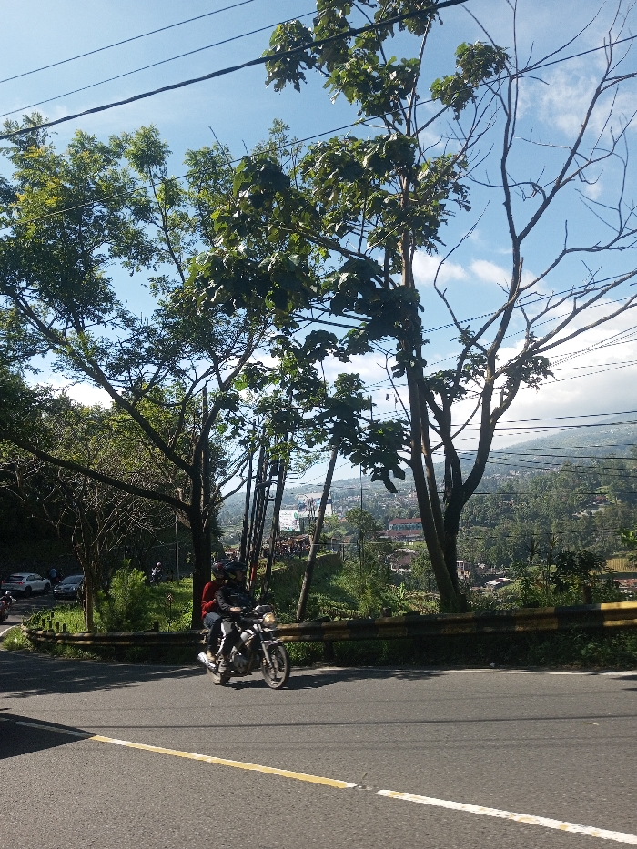 The image depicts an outdoor scene in Ka Thaung (Upper), Myanmar, on a clear, brightly lit day. In the immediate foreground, an asphalt road is visible, featuring a solid yellow center line and a broken white line. A motorcycle with two occupants is positioned on the road, traveling from right to left in the frame. The driver wears a dark jacket and a dark helmet, while the passenger, seated behind, wears a red garment and a dark helmet. Adjacent to the right side of the road, a yellow and black striped guardrail is present, partially obscured by green undergrowth. The mid-ground is dominated by various trees, some with dense green foliage and others with bare or sparse branches. Overhead, multiple black utility lines are visible against the blue sky, which contains scattered white clouds. Further to the left, several white cars are parked off the road. The background reveals a sprawling settlement or town situated on a hillside, characterized by numerous buildings and patches of vegetation. A large billboard is discernible within this urban landscape. Beyond the settlement, a tree-covered mountain range extends into the distant horizon under a partly cloudy sky.