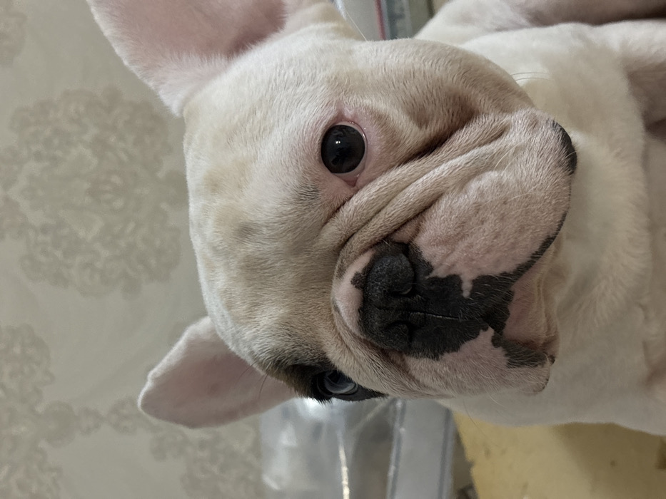 - "The image displays a white and cream-colored French Bulldog positioned indoors, looking directly forward" by FM-DSCl32, licensed under CC BY 4.0