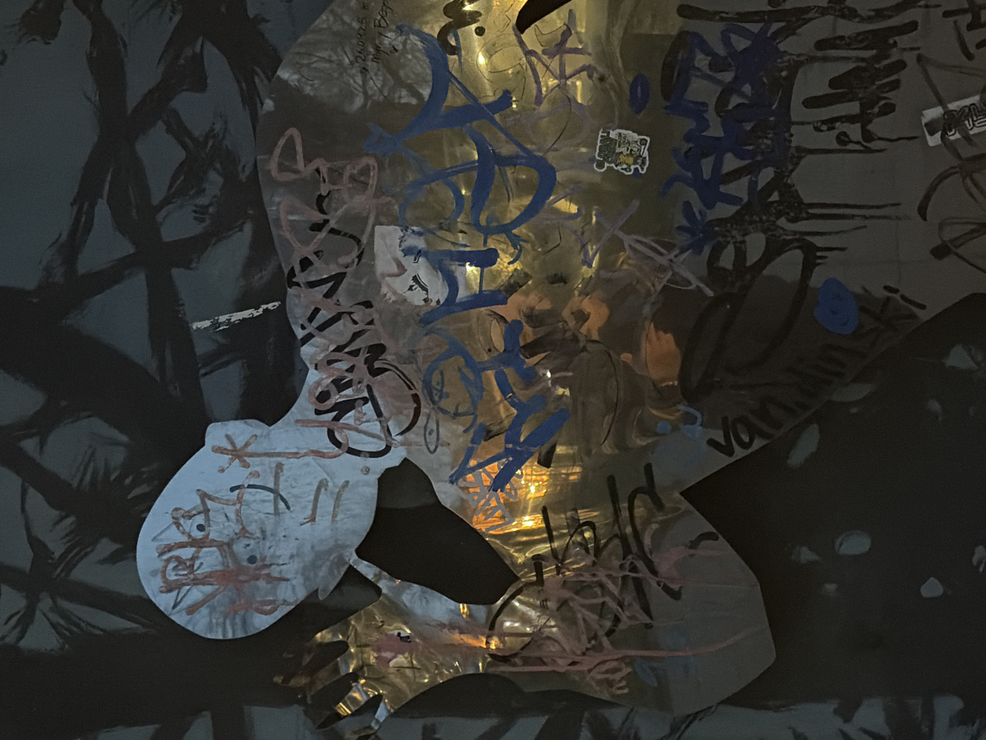 An indoor shot of street art with a metal sheet on a wall with graffiti, stickers, and lights