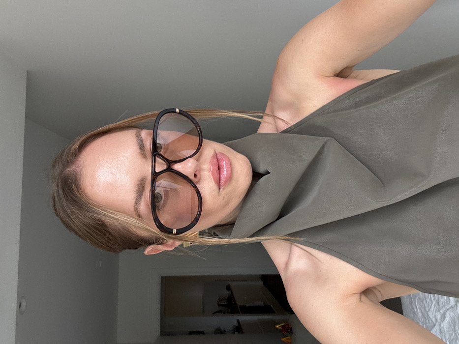 A woman with blonde hair wears oversized aviator glasses and a gray-green, high-necked top