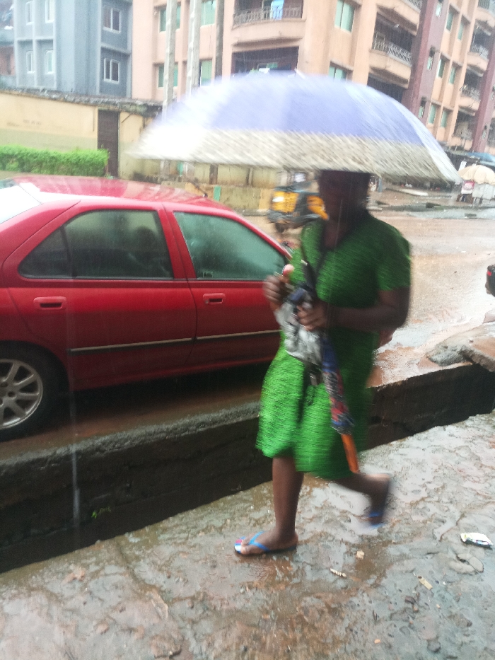 An urban scene in Onitsha, Nigeria, depicts a rainy day