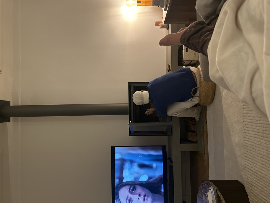 A person wearing a white hat, blue sweater, and white pants is crouching and reaching into a fireplace. A large black pipe extends from the fireplace horizontally across the left side of the frame. A television displaying a woman's face is visible below the fireplace. To the right, legs and feet are visible on a sofa, suggesting someone is relaxing nearby. The scene is lit by a warm, overhead light.