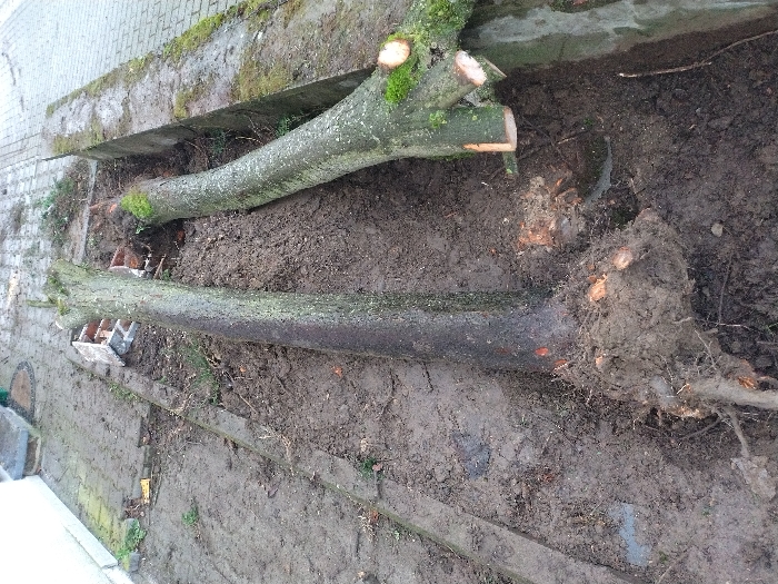 Two cut tree trunks lie in a trench of dark, wet soil alongside a weathered wall. The top trunk, lighter in color and moss-covered, has a clean cut end. The lower trunk, darker in hue, displays exposed roots caked with mud. Bricks and a concrete edge are visible on the left side. Moss grows on the top edge of the wall. The ground appears recently disturbed.