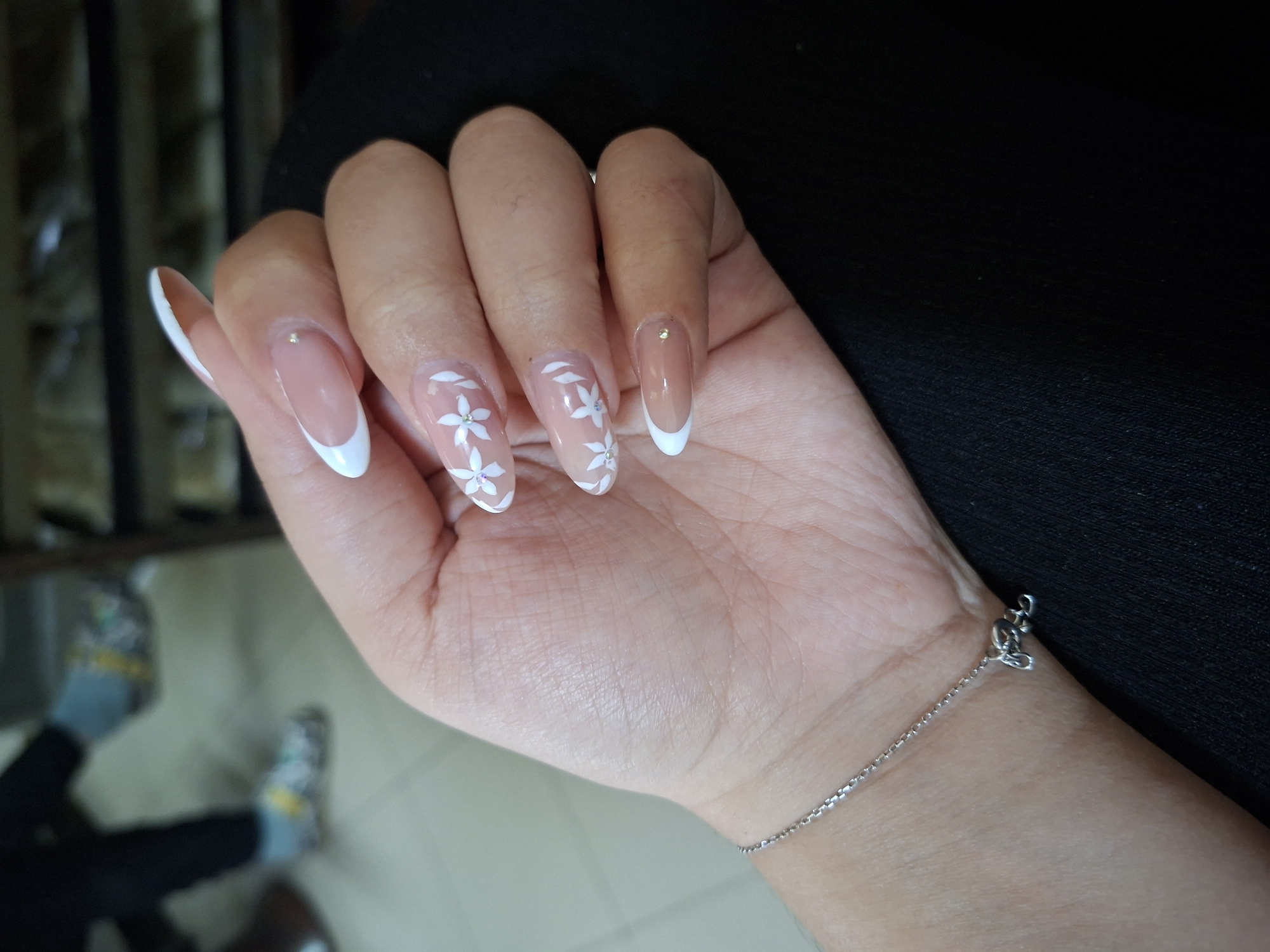 A close-up shot focuses on a person's hand, displaying manicured nails. The nails are almond-shaped with a French manicure design, featuring white tips. Two of the nails are adorned with delicate white flower patterns. A silver chain bracelet is visible on the wrist. The setting appears to be indoors, with a blurred background showing glimpses of furniture and flooring. The specific location is not discernible from the provided image. No evidence indicates the city of Dimitrovgrad, Bulgaria.