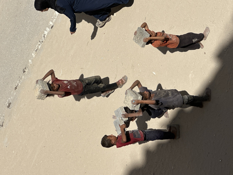 The image displays an outdoor scene in Khan Yunis, Palestinian Territory, under direct sunlight, evidenced by harsh shadows. Five children, appearing to be boys, are engaged in transporting square concrete blocks across a dusty, light-colored ground. One boy at the top right, wearing a red t-shirt, dark pants, and sandals, carries two concrete blocks on his head. He looks towards an adult female on the far right. This woman, partially visible, wears a dark blue abaya, a black head covering, and white sneakers, with her right arm extended forward. In the middle-left, a boy in a red t-shirt and dark pants, barefoot, holds two concrete blocks in his hands. Adjacent to him, a partially obscured child also appears involved with the blocks. Further to the lower center, a boy in a dark t-shirt and dark pants, barefoot, carries two blocks on his head, one bearing a small blue circular object. To his right, another boy in an orange t-shirt and dark pants, barefoot, similarly carries two blocks on his head. The children's clothing is soiled with dirt or dust. A darker, paved surface is visible along the top right edge of the frame.