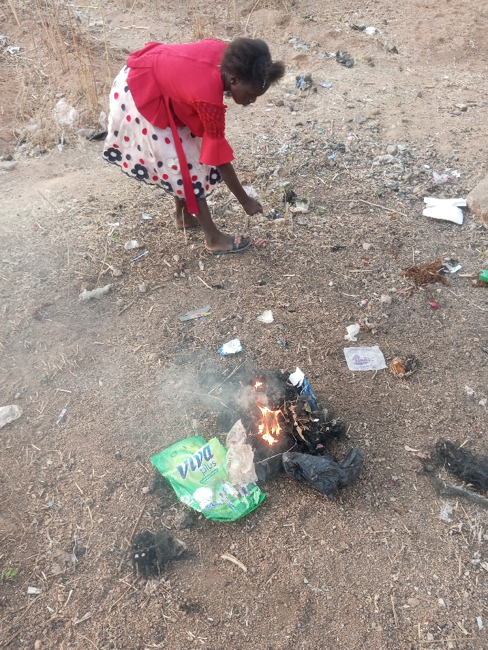 A young woman in a red shirt and flower-patterned skirt bends over a small fire on a dirt ground littered with trash. She holds a stick, appearing to stoke the flames. Visible near the fire are a green "Viva Plus" detergent package and pieces of plastic. The scene suggests poverty and environmental concerns as someone burns trash in an open, unkempt space.