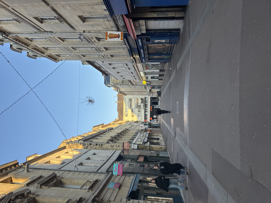 The image depicts a pedestrian street, Rue Saint-Pierre, located in Caen, France, under a clear blue sky. The street is lined on both sides by multi-story buildings constructed primarily of light-colored stone, featuring windows and architectural details characteristic of European urban environments. The upper portions of buildings on the left side of the street are illuminated by direct sunlight, casting the foreground and the right side of the street into shadow, suggesting a low sun angle. Overhead, several sets of string lights crisscross the street, forming an "X" pattern, and a spherical, spiky decorative ornament is suspended from these lines, centered above the street. On the left side of the street, shopfronts include a "Bleu Cerise" store with both blue and pink signage, and a partially visible "Grain de Café" sign. Several shops appear closed, with metal roller shutters pulled down over their entrances. On the right side of the street, shopfronts are also visible, including one with a sign featuring a doner kebab graphic and the text "Kebab de Caen," as well as a red awning directly beneath it. Further down the street on the right, an "Orange" telecom store sign is visible. Many shops on this side also appear closed, some with metal shutters. Three individuals are present on the street, all walking away from the camera. In the foreground, slightly to the left, two individuals are walking side-by-side. The individual on the left is wearing a dark jacket, light-colored jeans, and light shoes. The individual on the right is wearing a long dark coat, a patterned scarf, dark pants, and brown shoes. Further down the street, in the center, a third individual walks alone, wearing a dark hooded coat, dark pants, and dark shoes. The street itself is paved with varying shades of grey and dark grey material, appearing clean and free of significant debris. No vehicles are present on the pedestrian thoroughfare.